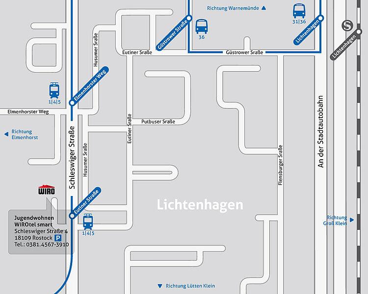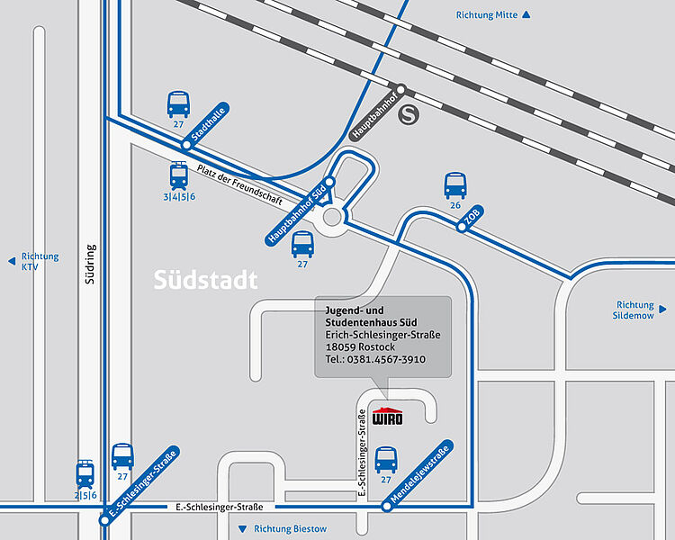 Das „Jugend- und Studentenhaus Süd“ liegt in der Nähe des Rostocker Hauptbahnhofes und nur wenige Schritte von Bus- und Straßenbahn-Haltestellen entfernt.